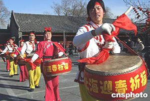 猴年臨近,來(lái)自河南新鄉(xiāng)王官營(yíng)風(fēng)雷盤鼓藝術(shù)團(tuán)的團(tuán)員們二十日在北京北海公園表演盤鼓,營(yíng)造熱烈的佳節(jié)氣氛。中新社記者:張勤