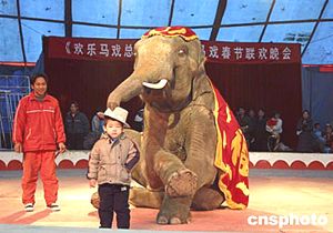 北京地壇廟會(huì)今年又添新節(jié)目,“歡樂(lè)馬戲總動(dòng)員”的大象為觀眾表演節(jié)目拜年。中新社記者:張煒
