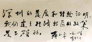 鄧小平散步回來(lái),一進(jìn)1號(hào)樓,就坐在門(mén)左邊的沙發(fā)上休息。李天增將深圳寫(xiě)好的、作參考的紙條拿給小平同志,紙條上擬寫(xiě)了幾條:深圳特區(qū)報(bào)、深圳青年報(bào)、大鵬展翅,這張紙條曾給吳南生同志看過(guò),他又加了一條:堅(jiān)持改革開(kāi)放,繼續(xù)辦好特區(qū)。鄧小平一看,說(shuō):“要寫(xiě)這么多呀?”李天增說(shuō):“這是深圳同志拿來(lái)的,不受這個(gè)限制,您想寫(xiě)什么就寫(xiě)什么!编囆∑诫S手丟開(kāi)紙條,胸有成竹地走向辦公臺(tái),拿起了筆,才寫(xiě)了幾個(gè)字,粘住了。李天增暗罵自己笨,房間里有暖氣,蘸在毛筆上的墨粘結(jié)了。他趕緊添水研墨后,換張紙,鄧小平重新提起了筆。這一次,他一揮而就:“深圳的發(fā)展和經(jīng)驗(yàn)證明,我們建立經(jīng)濟(jì)特區(qū)的政策是正確的!