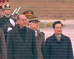 在希拉克陪同下,胡錦濤走上紅地毯,在法國軍樂隊(duì)演奏的中法兩國國歌聲中,檢閱了法國三軍儀仗隊(duì)。