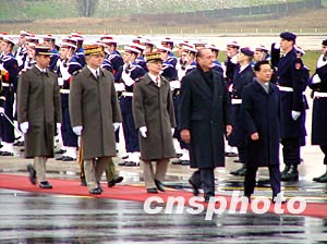 中國(guó)國(guó)家主席胡錦濤乘專機(jī)于巴黎時(shí)間下午兩點(diǎn)四十分抵達(dá)巴黎奧利機(jī)場(chǎng),開(kāi)始對(duì)法國(guó)進(jìn)行國(guó)事訪問(wèn),法國(guó)總統(tǒng)希拉克夫婦親自到機(jī)場(chǎng)迎接。圖為胡錦濤在希拉克陪同下,檢閱法國(guó)三軍儀仗隊(duì)。作者:曹偉