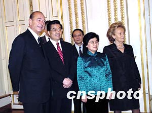 中國國家主席胡錦濤一月二十六日開始對法國進(jìn)行為期三天的國事訪問,法國總統(tǒng)希拉克當(dāng)日晚上在愛麗舍宮舉行國宴歡迎胡錦濤。圖為希拉克夫婦和胡錦濤伉儷共同會見來賓。作者:蔚中