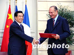 今天是中法建交四十周年紀(jì)念日,正在法國(guó)進(jìn)行國(guó)事訪(fǎng)問(wèn)的中國(guó)國(guó)家主席胡錦濤和希拉克在巴黎進(jìn)行了正式會(huì)談,會(huì)談后雙方簽署了“中法聯(lián)合聲明”。該聲明強(qiáng)調(diào),中法兩國(guó)將深化全面戰(zhàn)略伙伴關(guān)系,致力于建立更加安全、更加尊重多樣性和更加團(tuán)結(jié)的世界。作者:蔚中