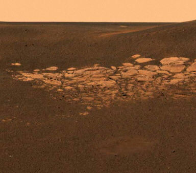1月28日美國宇航局公布了利用“機(jī)遇”號火星車發(fā)回的數(shù)據(jù)合成的照片。這張高清晰度的火星照片清晰地記錄了裸露在火星地表的巖床!皺C(jī)遇”號預(yù)計(jì)將在下周鉆出著陸艙,開始火星漫步探測。