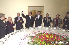 澳門特區(qū)政府二十九日在禮賓府舉行午宴,宴請(qǐng)澳門各新聞媒體,圖為行政長(zhǎng)官何厚鏵向出席午宴的嘉賓拜年。