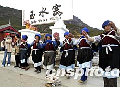 中國農(nóng)歷猴年正月,六名納西族老太太在云南麗江玉龍雪山腳下的旅游景點(diǎn)前用別致的民族歌舞,向游人表示新年的祝福,借以換取一定的經(jīng)濟(jì)來源。中新社記者:趙振清