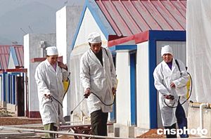 北京農業(yè)職業(yè)學院種雞場的員工對雞舍及周邊進行嚴格消毒,以防止禽流感發(fā)生。中新社記者:張宇