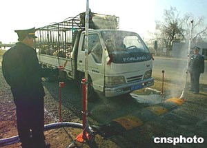 北京市相關執(zhí)法人員對外地進京車輛進行消毒,以預防禽流感。目前,北京市各相關部門采取積極措施,落實市政府“檢查關口前移,預防重點下移,嚴防死守”的預防禽流感要求。中新社記者:宋吉河