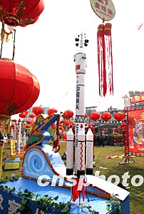 元宵節(jié)期間,浙江杭州信義坊廣場舉行的燈會上展示神州五號飛船模型。作者:吳敏