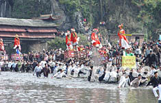 富有濃郁客家風(fēng)情的羅坊“走古事”,2月5日在“客家祖地”閩西連城縣羅坊鄉(xiāng)舉行,第四屆中國冠豸山客家民俗文化節(jié)由此拉開帷幕。羅坊“走古事”系由幾隊(duì)人馬各抬一架“古事”(上有一古裝打扮孩童),在陸上、水中爭先前行的民俗活動(dòng)。作者:黃翔