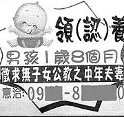 最近在臺(tái)中地區(qū)有一則夾報(bào)小廣告,登載者希望尋找沒有子女的中年公務(wù)員,收養(yǎng)他一歲八個(gè)月大的幼兒,廣告上留有行動(dòng)電話,由于春節(jié)前后類似的廣告有多起,引人注意,有多人打電話詢問對(duì)方原因,關(guān)心小孩處境。