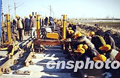 二月九日,京廣線鄭州段雙橋車站正在安裝目前中國(guó)國(guó)內(nèi)最先進(jìn)的鐵路提速道岔。列車通過(guò)此道岔的時(shí)速將由過(guò)去的四十公里提高到八十公里,并且沒(méi)有咔嚓聲。作者:慎重