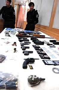 二月十三日,北京警方舉行新聞發(fā)布會,通報綁架中央實驗話劇院演員吳若甫的詳細(xì)案情,并展示以王立華為首的持槍綁架殺人犯罪團伙的作案工具。中新社記者:任海霞