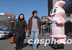 二月十四日是西方“情人節(jié)”,一家安全套銷(xiāo)售商在北京西單街頭向青年男女免費(fèi)派送安全套,許多情侶坦然接受。中新社記者:張煒