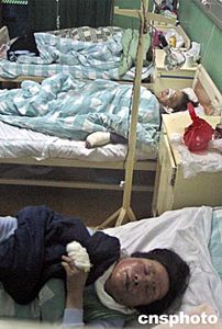 火災(zāi)造成四十人死亡,三人受傷。死者全系中老年女性,其中八十歲以上女性十人,死者平均年齡為七十二歲。圖為從火災(zāi)現(xiàn)場僥幸逃生的傷者在醫(yī)院接受搶救。作者:張茵  五十平方米的草棚已經(jīng)灰飛煙滅。作者:張茵