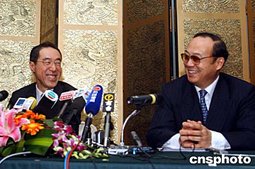 中國(guó)商務(wù)部副部長(zhǎng)安民(右)、香港特區(qū)政府財(cái)政司司長(zhǎng)唐英年等出席了簽署儀式,并就相關(guān)問題回答了記者提問。中新社記者:武仲林