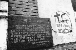 2月16日,記者(注:人民日報記者)在天津民主道23號曹禺舊居院墻上看到,緊挨著天津市文物局和天津市河北區(qū)文物管理所等單位懸掛的兩塊曹禺舊居紀念牌的,是一個約60厘米高的墨寫的“拆”字(如圖),旁邊還張貼著花花綠綠的各類“搬家公司”的小廣告。旁邊有的住家已人去樓空,三三兩兩收破爛的外地人正在曹禺故居外來回轉(zhuǎn)悠。