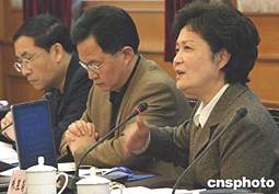 二月十八日,中國教育部舉辦新聞發(fā)布會介紹基礎(chǔ)教育課程改革措施。教育部新聞發(fā)言人朱慕菊(右一)表示,要通過基礎(chǔ)教育課程改革促進學生健康快樂地成長。中新社記者:張勤