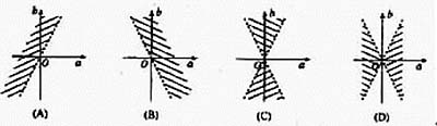 此題的完整解是(—b—>2—a—,且a≠0)。{證明:函數(shù)y=ax2+bx+a的圖像與x軸有兩個交點,就是方程ax2+bx+a=0有兩個不同的實根。其充分必要條件是a≠0,且b2>4a2。即(—b—>2—a—,且a≠0)。}在圖A、B、C和D中,凡虛線均表示不屬于區(qū)域的邊界,凡相鄰而不同斜率的陰影線均表示相鄰而不連通的區(qū)域,這是符合慣例的。[關(guān)于區(qū)域的定義,可見《數(shù)學》,第二冊(上),普通高級中學教科書,p.58: