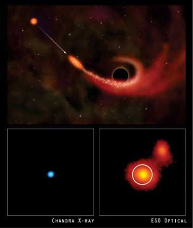 天文學家相信,被撕裂和部分吞噬的恒星是因為另一顆恒星擾亂了它的軌道,令其太過靠近黑洞而遭此“厄運”的。