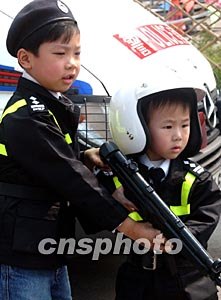 香港西區(qū)警區(qū)聯同中西區(qū)滅罪行委員會,二月二十二日舉行滅罪跑嘉年華活動,該活動的目的是透過有益的活動宣傳滅罪訊息并推廣健康生活,圖為兩位小朋友對展示的警務器械頗感興趣。中新社記者:錢興強