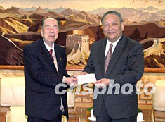中新社澳門二月二十四日電(記者孫兆震)全國政協(xié)副主席、澳門中華總商會會長馬萬祺24日下午到中央駐澳聯(lián)絡(luò)辦,向建設(shè)中的北京奧運場館國家游泳中心捐款一百萬港幣。