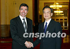 國務院總理溫家寶二十六日在北京會見丹麥首相拉斯穆森。中新社記者:滿會喬