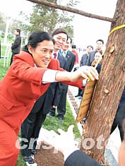 今日上午,一臉親和、恬美微笑的泰國公主詩琳通與宜昌市市長郭有明一起,植樹湖北宜昌世界和平公園,親手為象征兩國人民間友誼的蔥郁的三峽杉培土澆水。(完)
