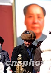 圖為一位農(nóng)民于三月份第一個周末在北京天安門前參觀游覽。中國國家總理溫家寶在日前所作的政府工作報告中有關(guān)“一年降低一個百分點(diǎn),五年內(nèi)取消農(nóng)業(yè)稅”的承諾,為全中國的農(nóng)民所矚目和期待。中新社記者:武仲林