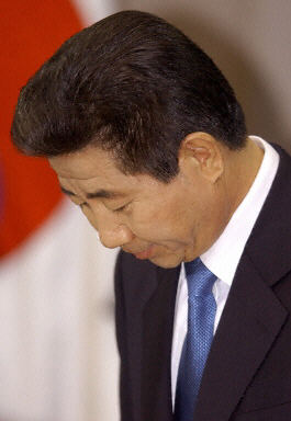 3月12日,韓國(guó)國(guó)會(huì)以193票對(duì)2票通過彈劾總統(tǒng)動(dòng)議案。如果此次投票有效,盧武鉉將成為韓國(guó)歷史上首位遭彈劾的總統(tǒng)。圖為11日盧武鉉舉行電視新聞發(fā)布會(huì),并向全國(guó)人民鞠躬。