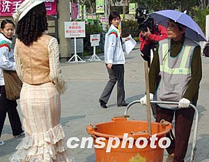 日前,在香港維多利亞公園一位頭戴別致遮陽(yáng)帽的環(huán)保員工,與身穿華麗服飾的港姐迎面而過(guò),兩人不同的服飾顯得各具風(fēng)采。作者:錢(qián)興強(qiáng)