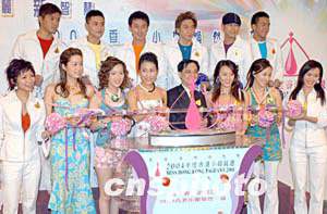 應(yīng)屆港姐曹敏莉、李嘉怡、戚黛黛、楊洛婷、李詩(shī)韻(右起)3月15日在香港出席《2004年度香港小姐競(jìng)選本地佳麗招募行動(dòng)》啟動(dòng)儀式,五人展示印上“新美麗新智慧2004香港小姐煥然一新”為口號(hào)的競(jìng)選報(bào)名表格。作者:鄧慶樂(lè)