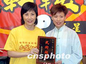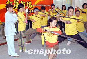 古裝武俠劇《血薦軒轅》劇中眾藝員3月17日在香港齊集李暉武術(shù)文化中心,邀請武術(shù)名師李暉小姐教授舞刀劍耍太極,為感謝李暉親自指導(dǎo),“阿姐”汪明荃代表無線電視向她贈送印有「武術(shù)超群」牌匾。作者:鄧慶樂