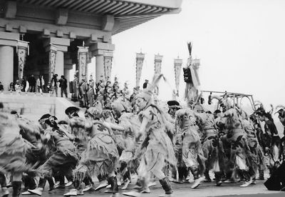 在此樂章中,各種道具將古老的巫舞和氏族的篝火舞相結(jié)合,服飾則采用了遠(yuǎn)古時(shí)期的巖畫、圖騰紋、甲骨文和象形寫意。12名扮鳳凰的少女、12名扮各種動(dòng)物的男子和12名頭戴圖騰面具的“部落首領(lǐng)”,手持羽毛編織的鳳旗、花桿等飾物,手牽手,揮舞著鳥羽、獸尾、圖騰柱踏歌而舞……