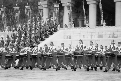 往年鳴放禮炮34響將改為“鳴鐘9響擊鼓34咚”(“9”是中華民族傳統(tǒng)最高禮數(shù),“34”代表全國34個(gè)省、市、自治區(qū)、特別行政區(qū))。所擊的一口2.73噸的金代大鐵鐘已在殿前懸架完畢。(韓宏)