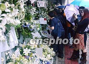 四月一日是一代歌星張國榮逝世一周年忌日,香港及海外眾多歌迷手捧鮮花冒雨來到文華酒店前,以不同方式表達(dá)對歌星張國榮的深切懷念。中新社記者:錢興強(qiáng)
