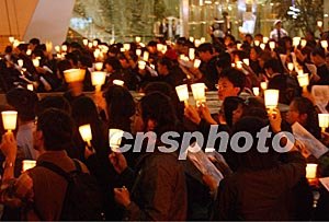 四月一日,是一代歌星張國榮逝世一周年忌日,眾多香港及海外歌迷來到文華酒店前,手舉燭光杯懷念歌星張國榮。中新社記者:錢興強(qiáng)
