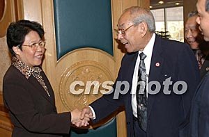 四月二日,中國(guó)國(guó)務(wù)院僑辦主任陳玉杰(左)在北京新世紀(jì)飯店會(huì)見(jiàn)來(lái)華的美國(guó)安良工商會(huì)訪(fǎng)問(wèn)團(tuán)全體成員。中新社記者:史利
