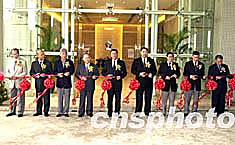 圖為澳門特區(qū)行政長(zhǎng)官何厚鏵為「第四屆東亞運(yùn)動(dòng)會(huì)澳門組委會(huì)總部」新大樓揭牌。