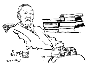 3月18日,入春后一個(gè)晴暖的日子,父親說,去看看張中行吧。先打了電話過去。當(dāng)我們下午3時(shí)準(zhǔn)時(shí)叩開張中老的家門時(shí),他的女兒邊迎我們進(jìn)屋邊說:“我父親早就在書房等著了,還問,這父子倆怎么還沒來?”在朝東的那間僅有七八平方米的書房里,張中老正安坐在書桌前的藤椅上。他看上去精神不錯(cuò),氣色也挺好。只是因近兩年行動(dòng)困難而少活動(dòng),加上老年性嗜睡,臉龐有些虛胖,舉止有些遲緩。問起近況,得知?jiǎng)偰赀^九五的張中老每天尚能依杖在屋里慢慢走走,偏愛甜食,飯量已不如從前。這天,當(dāng)張中老為這幅畫像題字時(shí),感到他握筆顯得有點(diǎn)費(fèi)力,寫出的字跡也有些抖顫。見狀,不禁生出歲月無情之嘆。自2000年擱筆后,老人最大的樂趣就是聽京戲,偶爾翻翻閑書。我隨手拿起書桌上放大鏡旁邊放著的一本刊名《開卷》的裝幀素樸的小開本雜志翻看,見上面有張中老的朋友范用等人寫的文章。由此引出張中老的一個(gè)話題。他慢慢說道:“現(xiàn)在有人辦雜志,盡愛登一些讓人讀不懂的文章。創(chuàng)辦過《讀書》雜志的范用就講,有本原來文風(fēng)不錯(cuò)的雜志,現(xiàn)在登的文章就連他都看不明白了,那還看它干什么!边@段話使我聯(lián)想起閱讀張中老的書,總會(huì)覺得仿佛是在和這位仁厚的老人一同負(fù)暄,聽他用淺近易懂又含蘊(yùn)深厚的話語向你娓娓講述悠遠(yuǎn)的故事和做人的道理。再問起張中老坐下的藤椅,沒想到老人對(duì)幾十年前的舊事仍記得真真兒的:“我記得是民國(guó)二十一年(1932年)買的,還記得是在離沙灘北大紅樓不遠(yuǎn)的八面槽買的”。算算這把藤椅已伴隨他72年了。細(xì)看老人在扶手處纏繞的白塑料繩早已磨出了一片片毛茬。