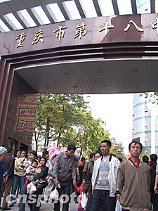 四月十八日下午四點(diǎn)多,被臨時(shí)安置在重慶市第十八中學(xué)的群眾得到"可以回家"通知,大家歸心似箭。為急于回家的群眾涌出該學(xué)校大門。作者:郭晉嘉