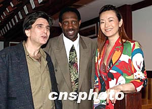 旅美華裔歌手張妮可(右),將在四月二十四日NBA季后賽休斯頓火箭隊與洛杉磯湖人隊的比賽中獻(xiàn)唱自己的第一首英文歌曲《姚明之歌》,祝愿姚明表現(xiàn)卓著。美東時間四月二十二日中午,張妮可在紐約與這首歌的共同作曲者貝林(左)和郝斯頓(中)向媒體宣布了這個消息。作者:龔文謨