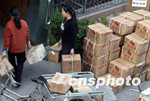 北京市出現(xiàn)新的SARS疫情后,許多批發(fā)商販聞風(fēng)而動(dòng)緊急進(jìn)貨SARS消毒液。四月二十三日下午,北京西城區(qū)天意市場(chǎng)的一家商販將新進(jìn)的“84消毒液”運(yùn)進(jìn)貨柜!84消毒液”是北京地壇醫(yī)院研制的專門殺滅肝炎病毒的消毒液,對(duì)殺滅SARS病毒有明顯效果。中新社記者:任晨鳴