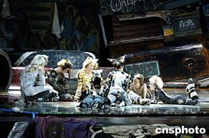 將于四月二十七日在北京人民大會(huì)堂大禮堂隆重上演的著名音樂劇《貓》,舞臺(tái)已經(jīng)搭建完成,二十五日演員正在緊張排練。中新社記者:毛建軍