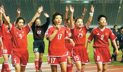 下半時(shí)15分鐘,曲飛飛接到浦瑋的傳球后,并沒(méi)有急于出腳,她在冷靜的調(diào)整、撥球后,在最合適的位置起腳,韓國(guó)隊(duì)門將金正美努力地伸出右臂,但飛飛的射門力拔千鈞。范運(yùn)杰、滕巍、浦瑋興奮得恨不得把飛飛按倒在地。直到下半時(shí)35分鐘,海濤才舍得用張穎換下飛飛,因?yàn)轱w飛的腿已經(jīng)被對(duì)方踢得青一塊紫一塊。