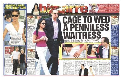 美國娛樂雜志《Bizarre》在最新一期中報道說:“尼古拉斯·凱奇將和身無分文的19歲餐廳服務生愛麗斯·金結(jié)婚。這不是電影,而是活生生的事實!