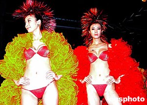 五月,著名的黛安芬內(nèi)衣公司將全面上市2004“危險(xiǎn)曲線(xiàn)”內(nèi)衣新品。圖中模特展示的是新品內(nèi)衣“奢華曲線(xiàn)”情景,這款內(nèi)衣淡淡的桃紅色內(nèi)襯著純白的刺繡蕾絲,晶扣設(shè)計(jì)搭配低胸剪裁,奢華中盡展女性的嫵媚。中新社記者:王麗南