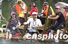 五一黃金周期間,廣東省惠州市香溪堡生態(tài)旅游景區(qū)以濃郁的嶺南風(fēng)情成為旅游熱線。圖為乘坐竹筏漂流的游客戲水享樂。作者:陳文