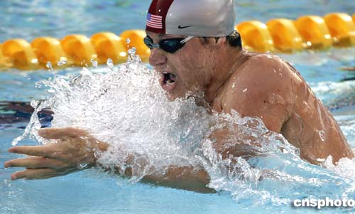 圖為8月18日,美國選手漢森在奧運男子200米蛙泳比賽中奮力拼搏的情景,他奪得該項目的銅牌。