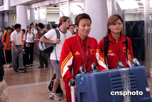 中新社北京八月二十日電(記者高凱)戰(zhàn)敗而回的中國女足今天從雅典回到北京,盡管飛機(jī)晚到了將近四個(gè)小時(shí),她們?cè)跈C(jī)場(chǎng)依舊受到媒體、足協(xié)和部分球迷的歡迎。